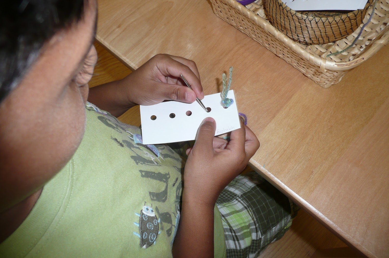 The child chooses the inset he/she wishes to work with and places it on the frame. Then paper and pencils are added and the work is taken to a table. This child was very curious about the insets and so was given a lesson.
